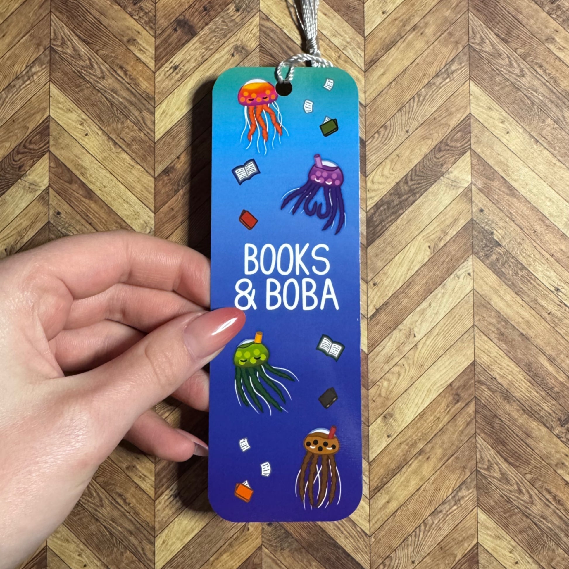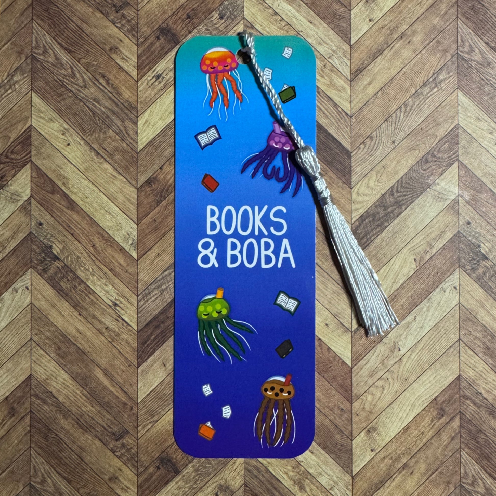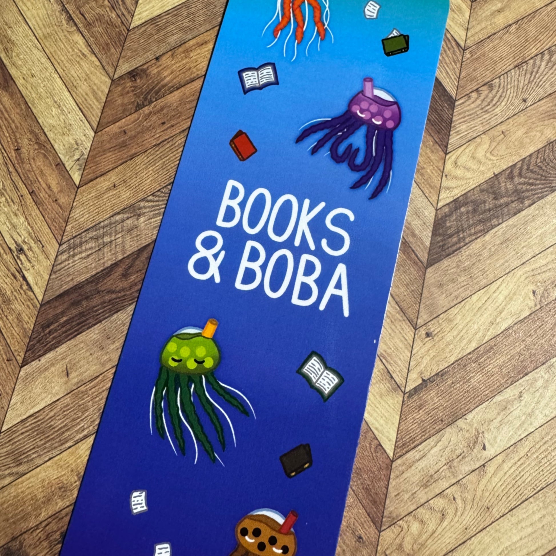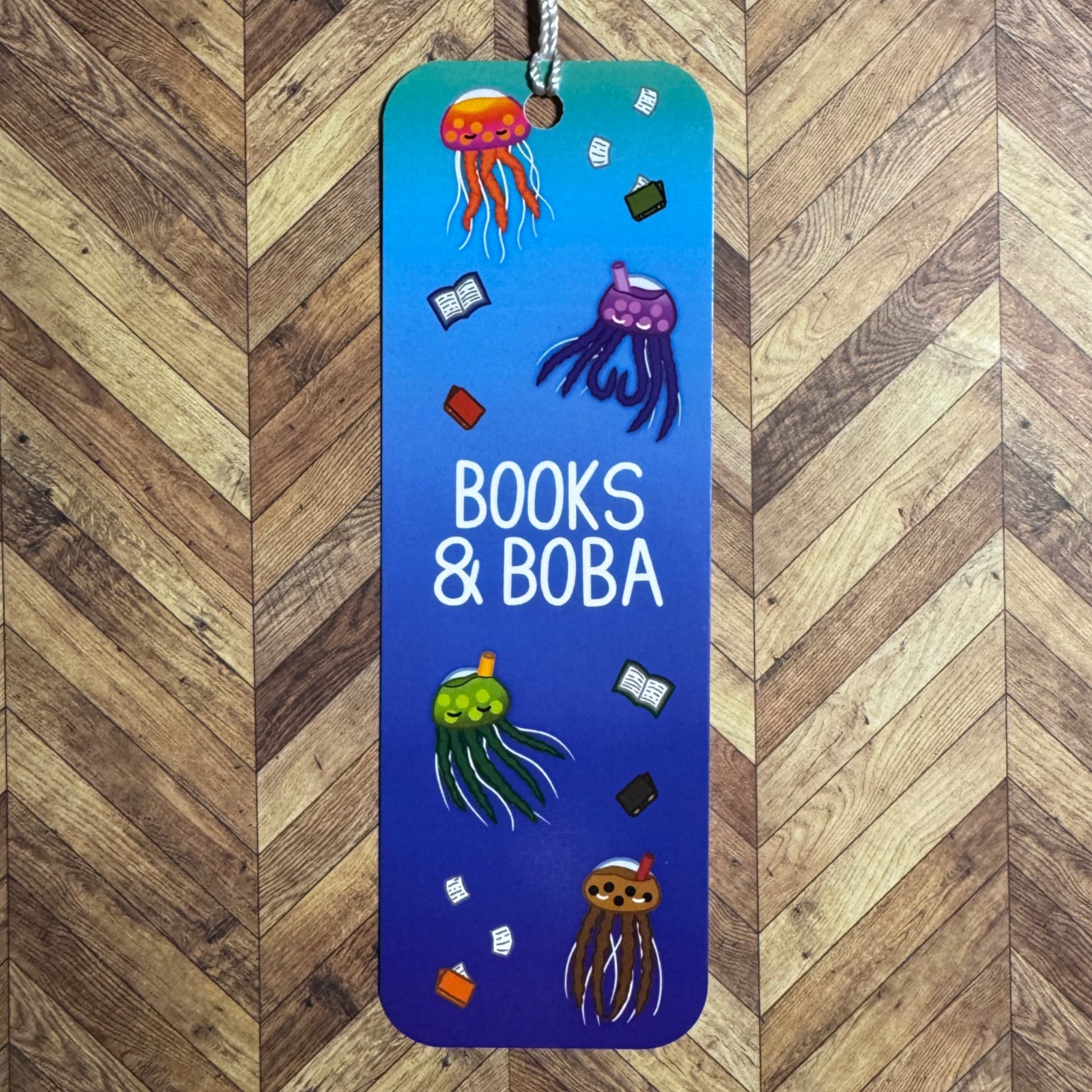 This bookmark showcasing kawaii bubble tea jellyfish swimming amongst spicy romance reads and murder mystery novels . These adorable bookmarks show a splash of your personality and make a perfect addition to any bookworms hoard. Not recommended for the illiterate.